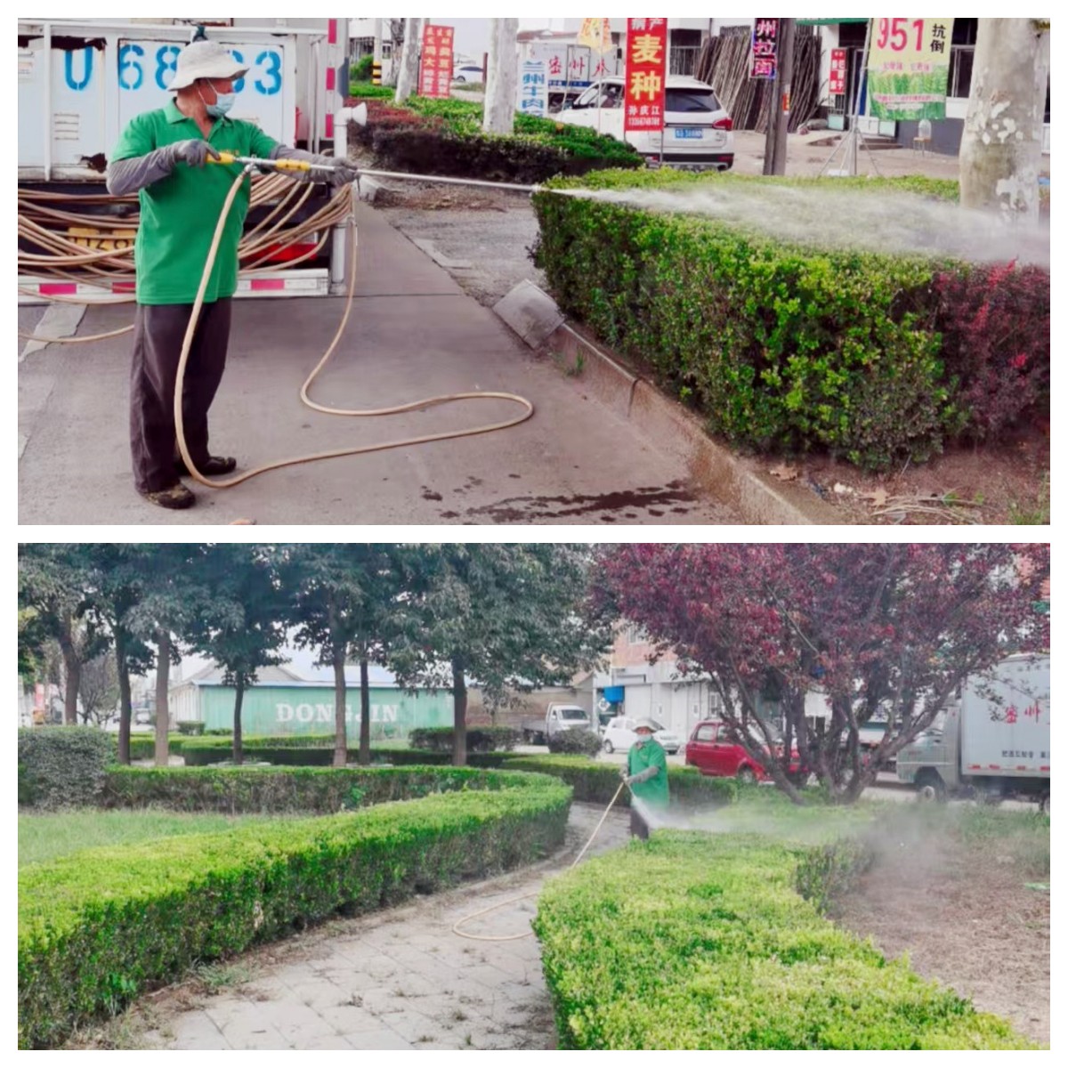 近日,养护管理部对黄杨喷洒药物进行黄杨绢野螟病虫害防治,保护城市绿化成果。