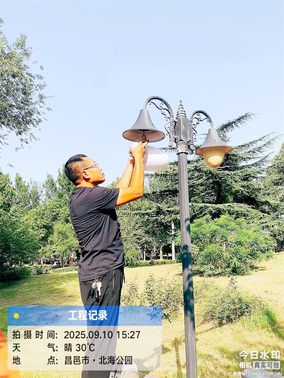 近日,公司技术人员对北海公园内景观灯进行维修保养,保证夜间照明正常使用,方便市民游园。