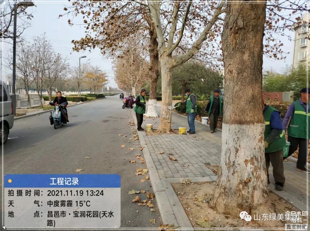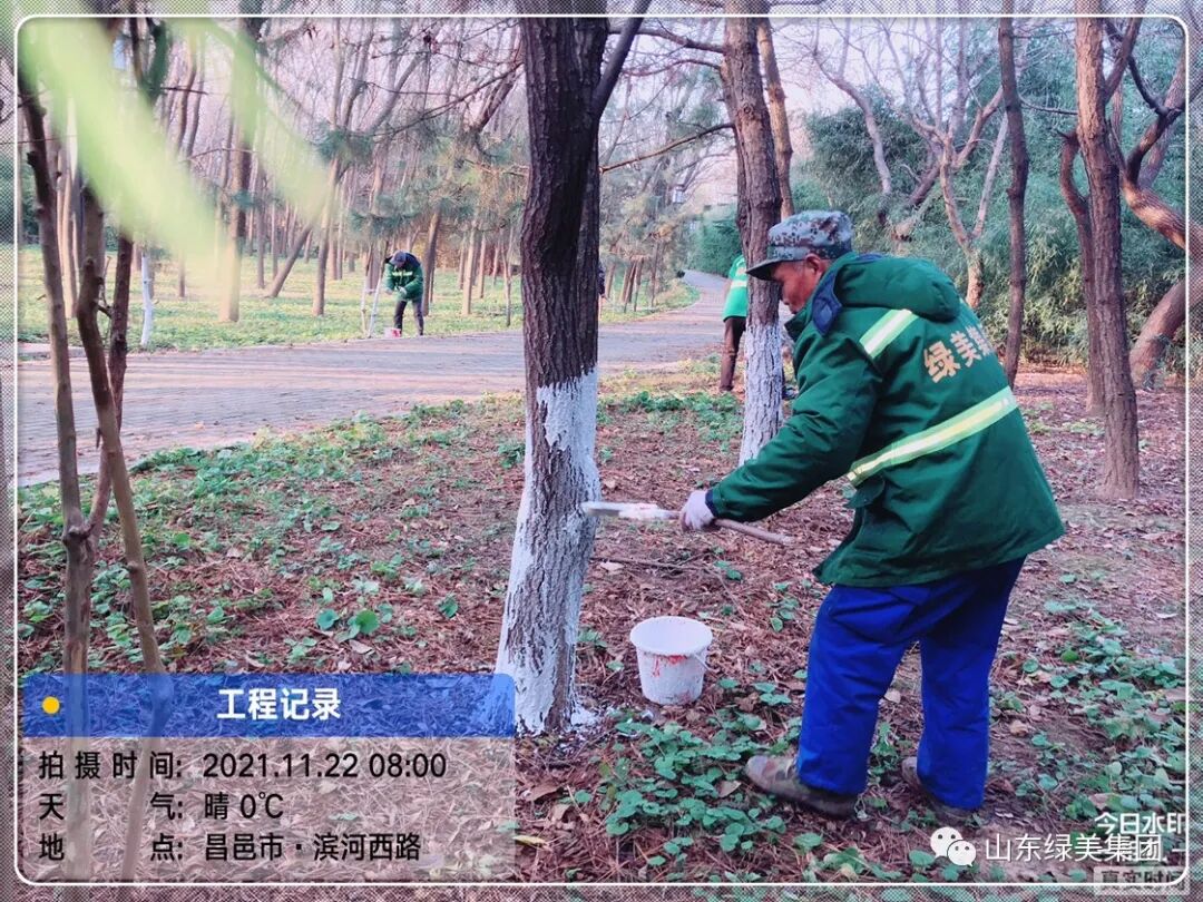 为提高行道树的抗寒性与抗虫性,美化城市景观,集团严格按照比例配置涂白剂,对管辖范围内的所有行道树进行高标准涂白,既消灭树皮内藏匿的虫卵、病菌,又防止因冬季早晚温差大导致的树干冻害。