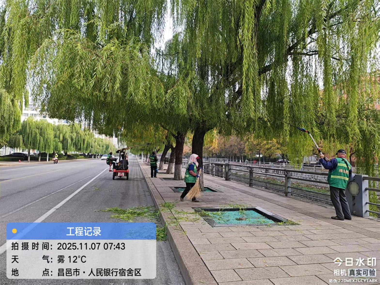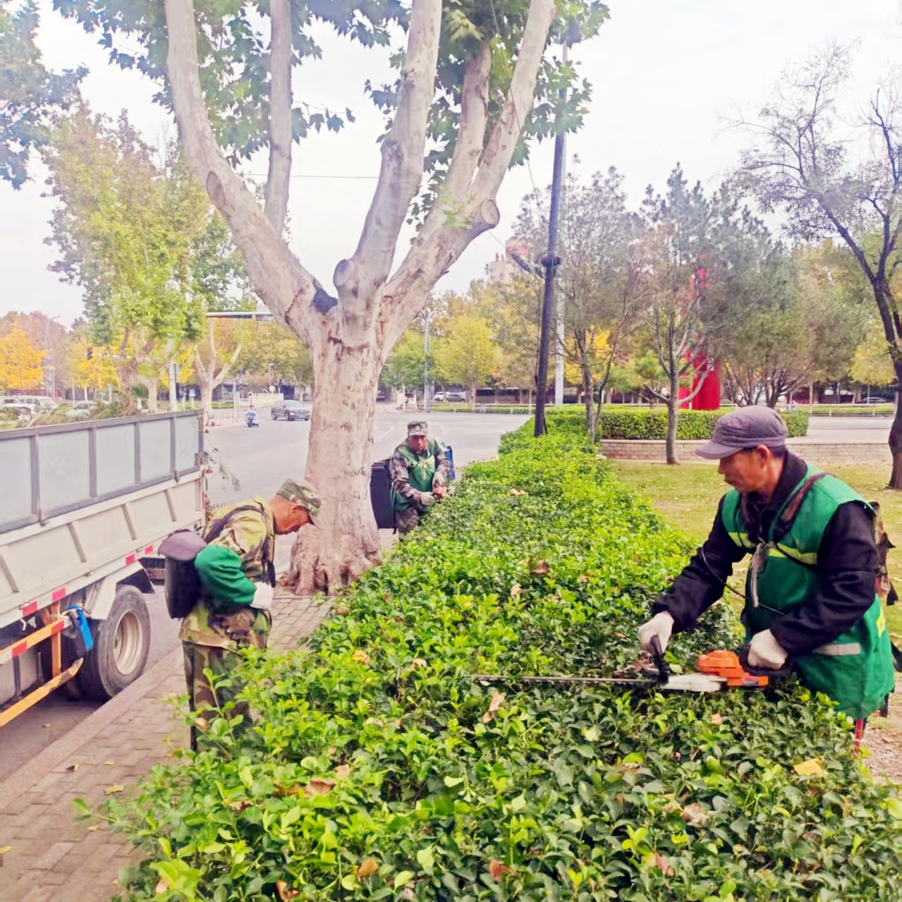 修剪作业严格遵循“因植施策、冬前蓄能”原则:对乔木,重点清除病弱枝、交叉枝等无效枝条,减少冬季养分无谓损耗,为来年萌芽积蓄能量;对灌木,结合冬季景观需求修剪造型,严控植株高度与冠幅,确保线条整齐、形态饱满;对绿篱,采用人工+机械相结合的方式,统一修剪塑形,打造平整连贯的边界,维持冬季绿化景观效果。