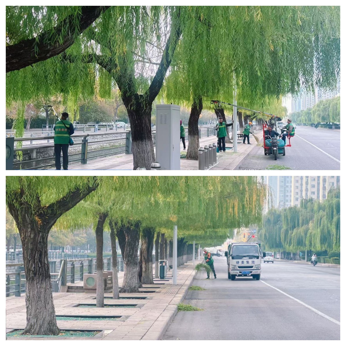 近日,养护管理部对天水路垂柳枝条进行统一修剪,修剪至同一高度,改善景观效果,方便市民通行。